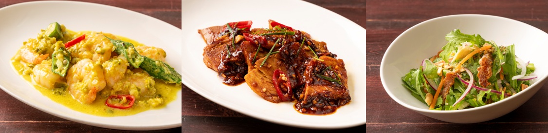 プリプリの海老に青唐辛子のすっきりとした辛みとココナッツミルク香るソースで仕上げた“海老のサンバル ボスタダール”をはじめ、豚バラ肉をタマリンドが効いた甘酸っぱいソースに絡めた“アッサムバビゴレン”、春菊をタイの味噌とライムの効いた自家製ドレッシングで楽しむ“春菊と干し柿のサラダ タオチオとライムのドレッシング”を、ぜひお楽しみください。